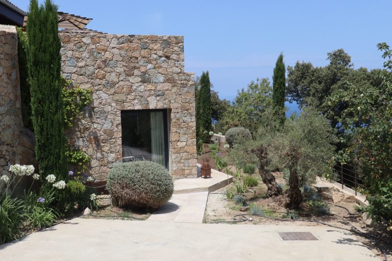 Dans le prolongement des chambres, une spacieuse terrasse donne accès à la piscine de 13m x 5m. Elle est dotée de 8 transats et d’une douche extérieure en pierre de pays.